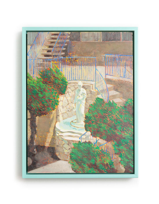 This body of work called Private Versaille began as an exploration of the relationship between art and nature in the urban environments of Southern California, but over time it revealed itself as a kind of complicated love letter to the city. The three paintings—Chateau Lisa, Chateau Beth, and Hebe—each depict sites in and around Long Beach, CA where grand, classical references are layered onto modest architecture. The “Chateaus” are sister apartment complexes facing each other, styled with faux-European flair and marked by plaster-cast Greek sculptures. Hebe, in the neighboring town, shows the goddess standing quietly in front of a small and dated 1950s beach apartment complex, which I endearingly call "dingbats". These juxtapositions of ancient ideals and contemporary kitsch reveals the peculiarity of Southern California: charming from a far, but somewhat absurd up close.